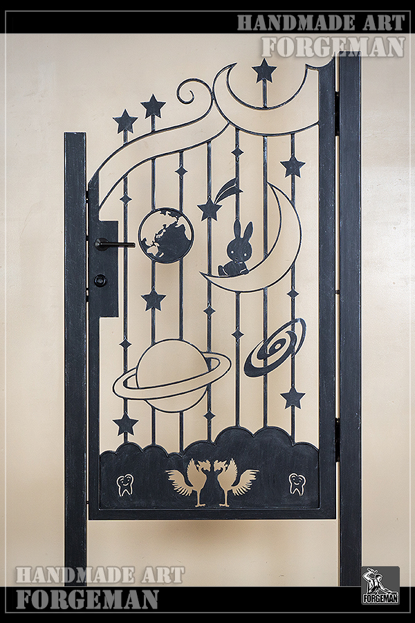 遊び心とユニークなデザインが目を引く宇宙をイメージした可愛いイアン門扉です。このロートアイアン製開き門扉は、単なる門扉としての役割に留まらず、家や建物の美しさを引き立たせ、訪れる人々に驚きを与えることができるものです。一般的な門扉と異なり、独創的で美しいデザインが施されており、そのデザインはまるで芸術品のよう。ロートアイアン素材は、優れた耐久性と強度を持ち合わせ、繊細で美しい曲線が表現できるため、他の素材では実現しにくい洗練されたデザインが可能となります。家や建物のエントランスを美しく装飾することができ、周囲の人々にインパクトを与えることができる点でも魅力的です。