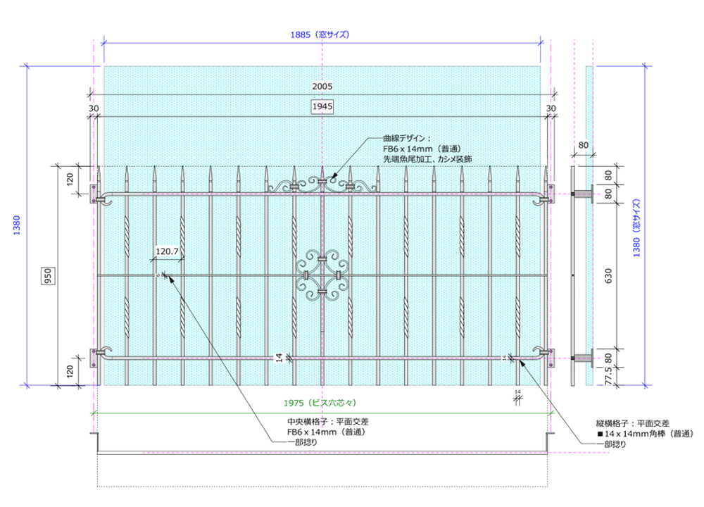 美しいクラシックデザインと鉄の重厚感が感じられる丁寧にハンドメイドでオーダーメイド製作されたロートアイアン製の窓面格子パネルです。窓の全面を覆うのではなく、解放感もあり美しく見えるようなバランスで高さが考えられています。